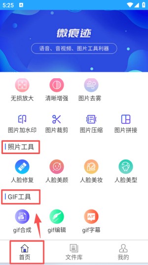1、在微痕迹首页,除了原有工具,还能看到照片工具GIF 工具等分类,包含图片去雾,gif 合成等功能按钮。