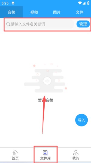 2、进入文件库的音频标签页,顶部有搜索栏可输入关键词查找文件,页面中间显示暂无音频,可通过导入按钮添加内容。
