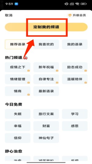 1、首先在频道页面点击 “定制我的频道”,可在推荐语录分类下,选择热门、今日免费等频道的内容。
