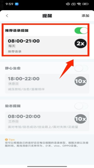 4、最后进入提醒设置页面,开启 “推荐语录提醒”,可设定时间范围与推送次数,接收频道更新。