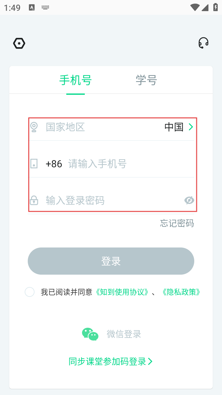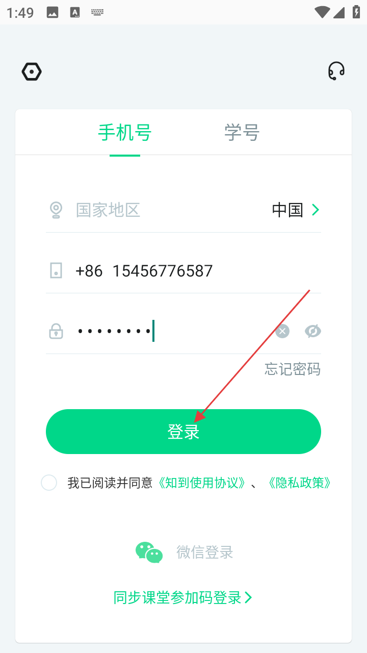 4、输入好手机号和密码后,点击绿色的【登录】按钮,即可尝试登录知到APP。
