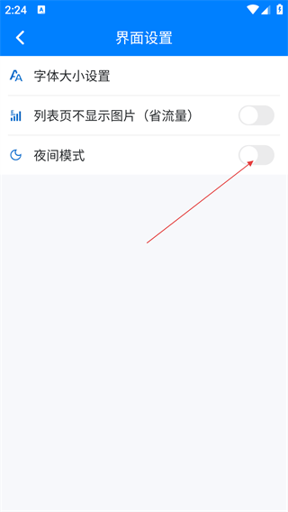 4、进入【界面设置】页面,可调整【字体大小设置】,还能开启【列表页不显示图片】【夜间模式】等功能。