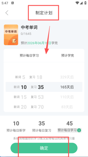 2、点击中考单词项进入制定计划页面,可选择每日学习的新词与复习数量,选好后点击 “确定” 完成计划设置。