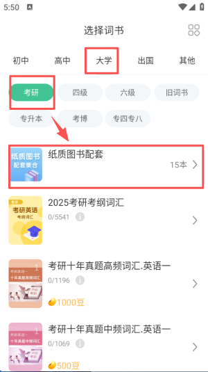 4、切换到 “大学” 分类,选定 “考研”,可看到纸质图书配套的考研词汇书,以及考研真题高频词汇等学习项。