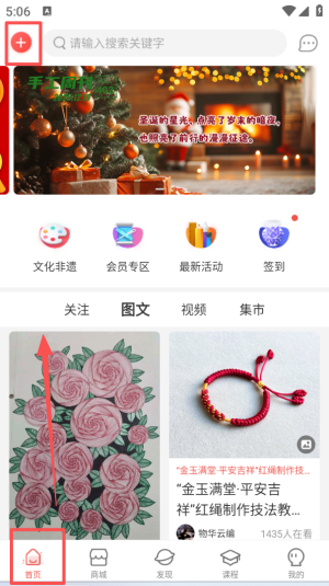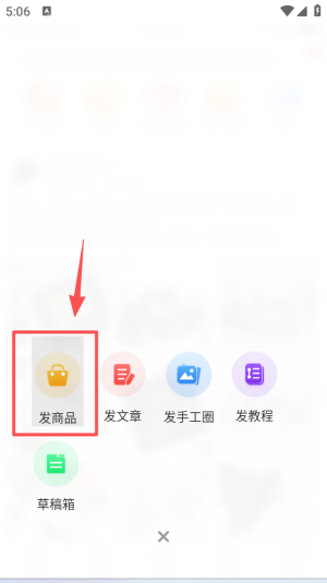 4、点击首页的发布按钮,会弹出操作菜单,其中包含发商品、发文章、发手工圈等不同的内容发布选项可供选择。