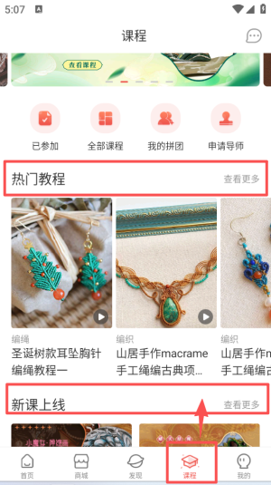 2、进入课程页面,上方分布着已参加、我的拼团等功能按钮,中间呈现热门教程内容,还能看到新课上线的相关板块。