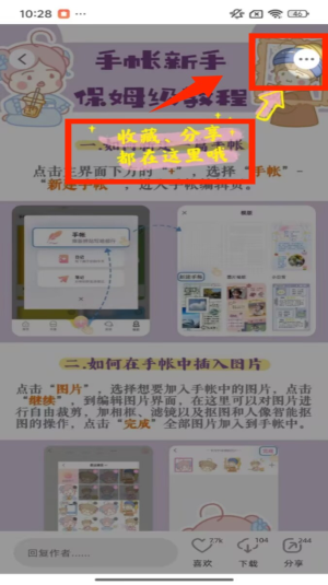 1、在新手教程页面,点击右上角的更多按钮,可看到收藏、分享等选项,按需对教程内容进行操作。