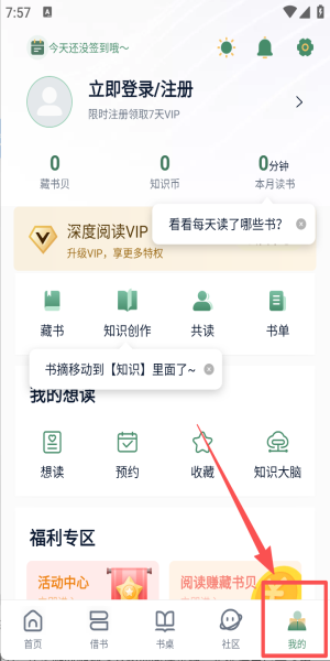 4、每日签到领藏书贝与知识币,限时注册再送7天VIP畅享深度阅读。