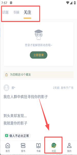 2、点社区“立即登录”解锁动态,登录后才能发布书摘与关注藏友。