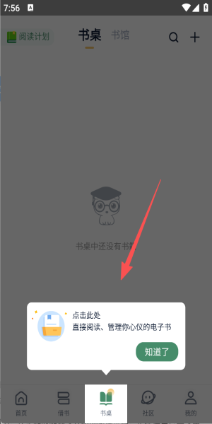 3、空书桌点提示“知道了”完成引导,随后可在书馆管理已借图书。