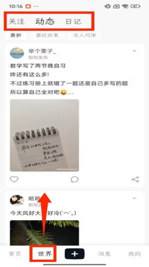 3、然后切换到 “世界” 页面,可选择关注、动态、日记等标签,查看其他用户发布的动态内容。