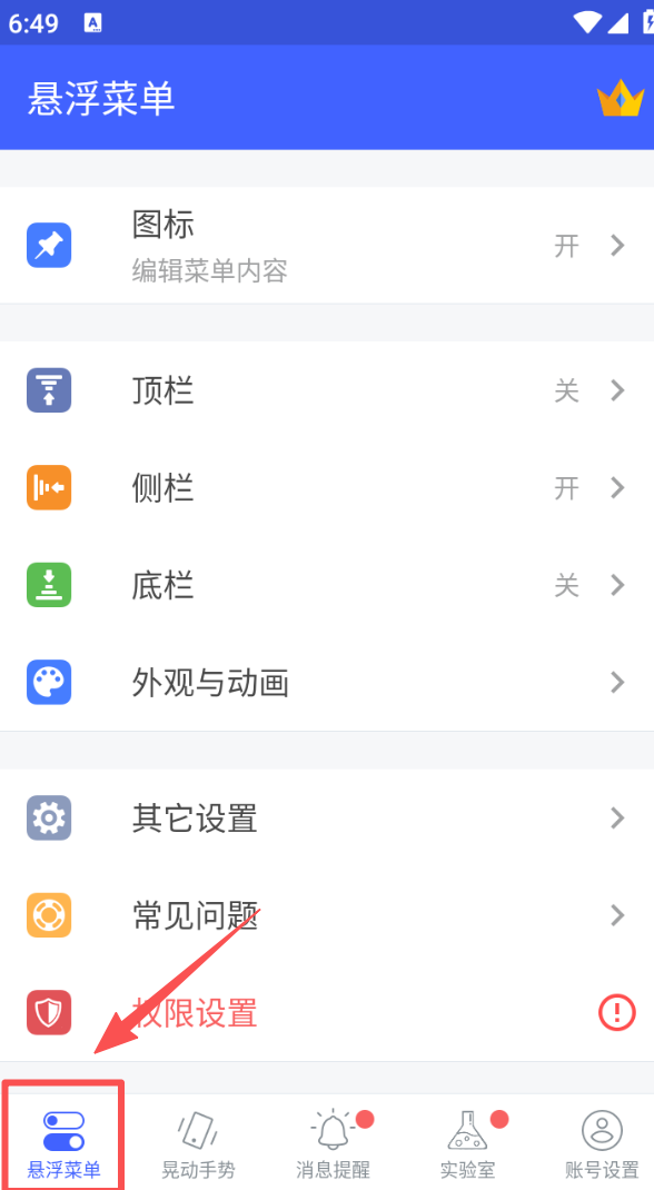 1、进入软件后,点击底部 “悬停菜单” 板块,可对图标、顶栏、侧栏等菜单内容及显示状态进行设置。
