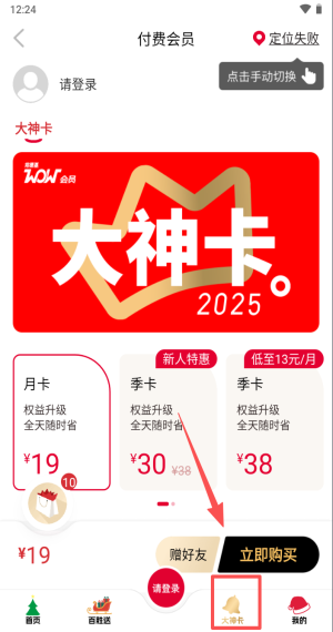 3、点“大神卡”选季卡13元,登录后购买可全天随时省赠好友。
