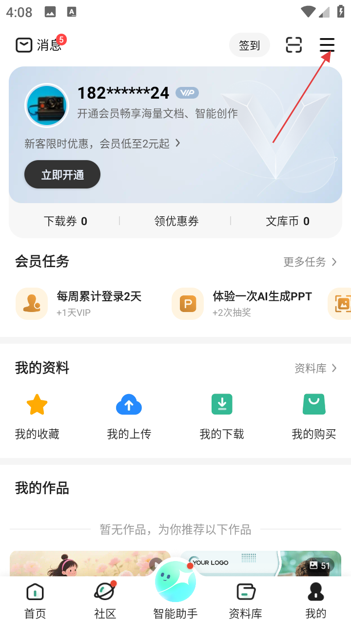 1、打开百度文库类APP,进入【我的】页面后,点击右上角三条横线样式的菜单按钮。