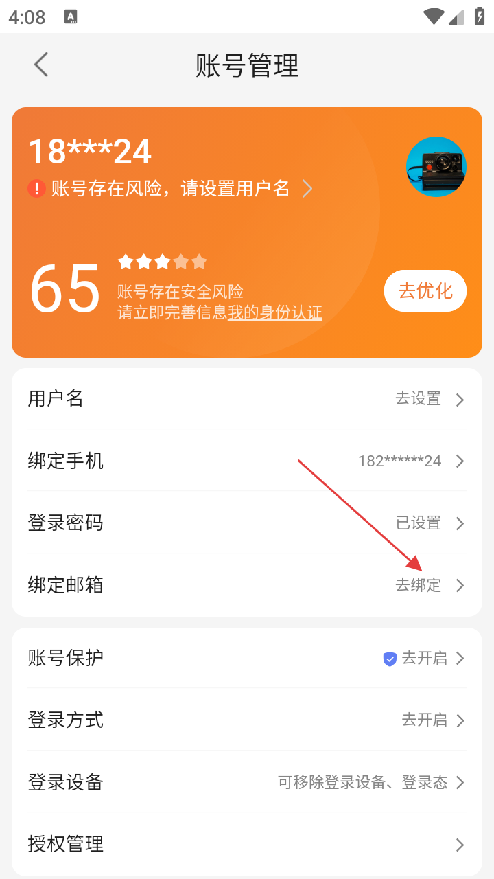 4、在账号管理页面,可进行如绑定邮箱等操作,点击【绑定邮箱-去绑定】即可进行邮箱绑定。