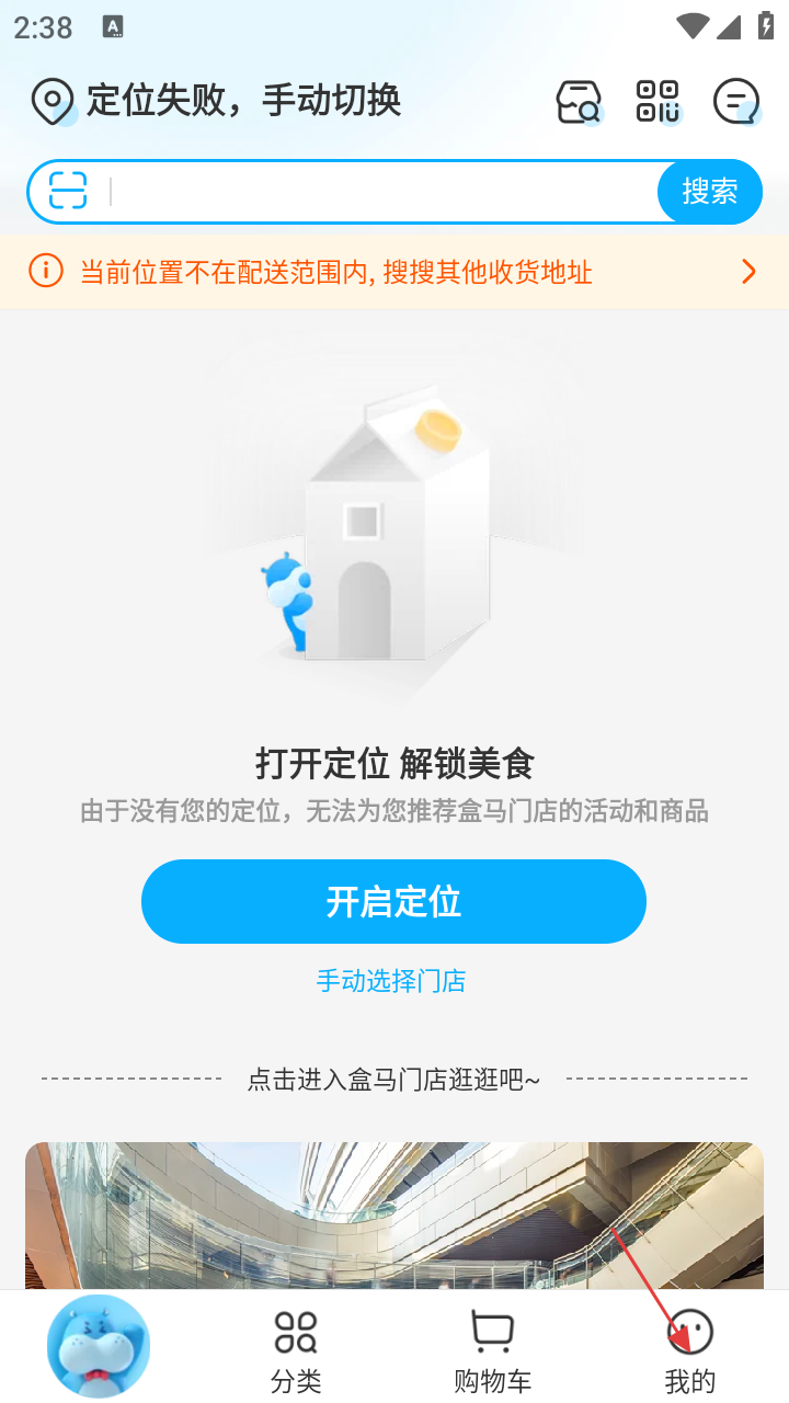 1、在盒马APP首页,可进行商品搜索,点击【我的】进入个人页面。