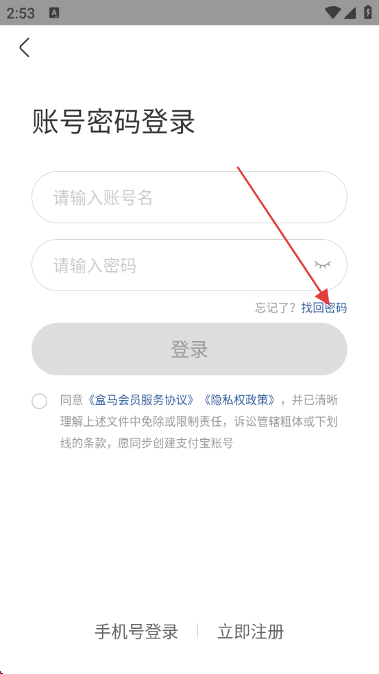 3、在账号密码登录页面,点击【找回密码】进入找回密码页面。