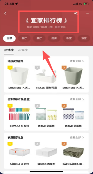 2、进入宜家排行榜按7日销量排序,苏纳斯塔收纳件热销居前。