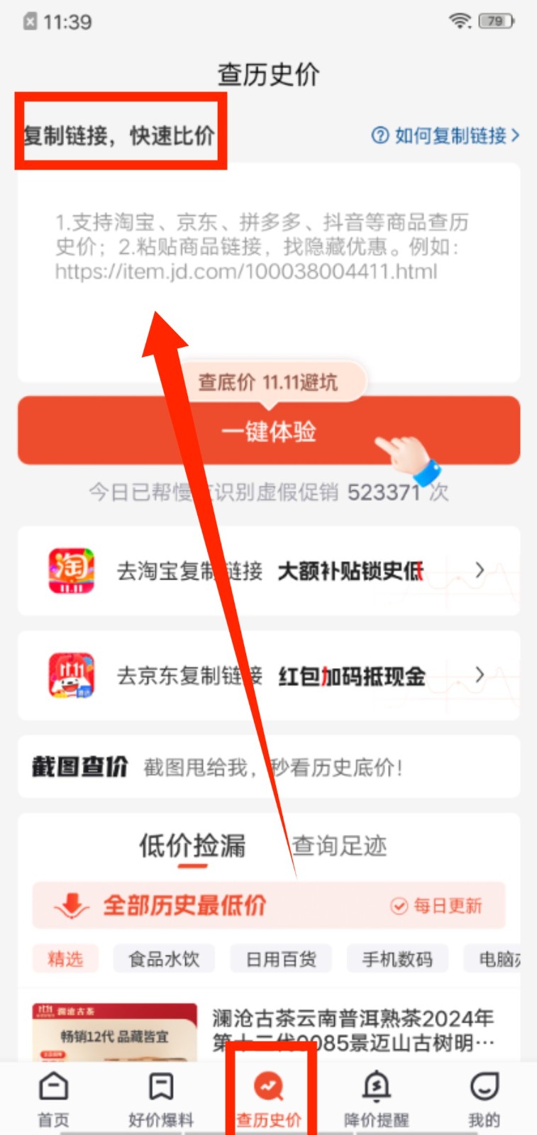 2、在查历史价页面,复制商品链接并粘贴至输入框,即可快速比价。