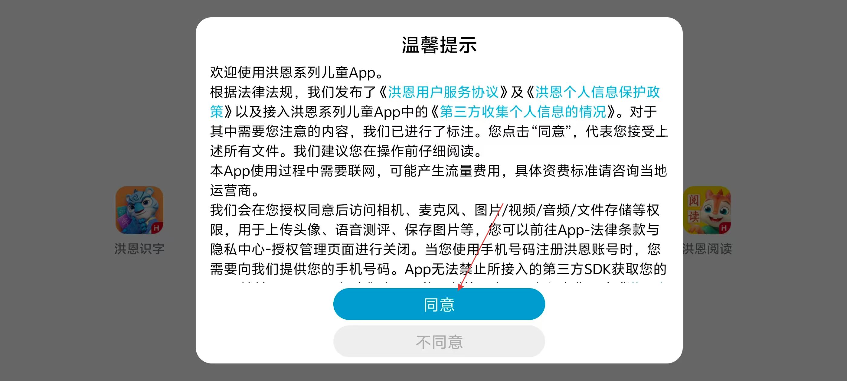 1、使用洪恩识字前,需阅读《洪恩用户服务协议》《洪恩个人信息保护政策》等,点击【同意】方可使用。