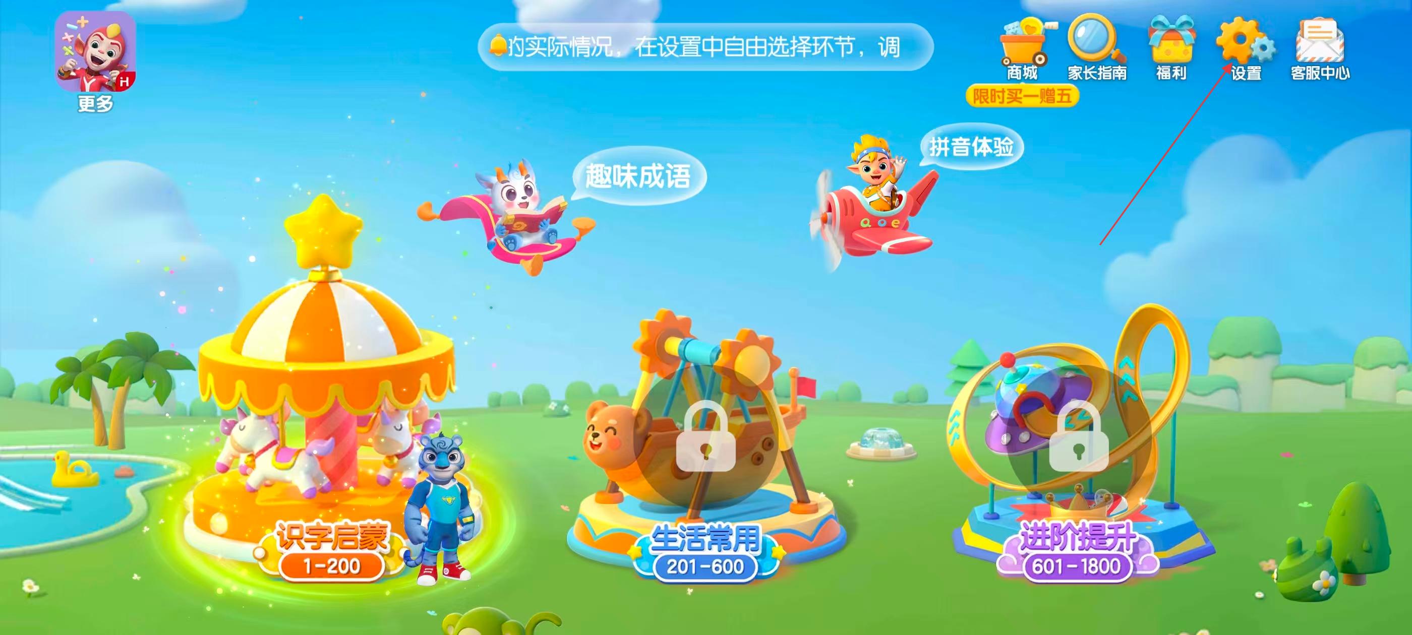 2、进入洪恩识字APP学习界面,有识字启蒙、生活常用等学习内容,还有趣味成语、拼音体验等板块,点击【设置】可进入功能设置界面。