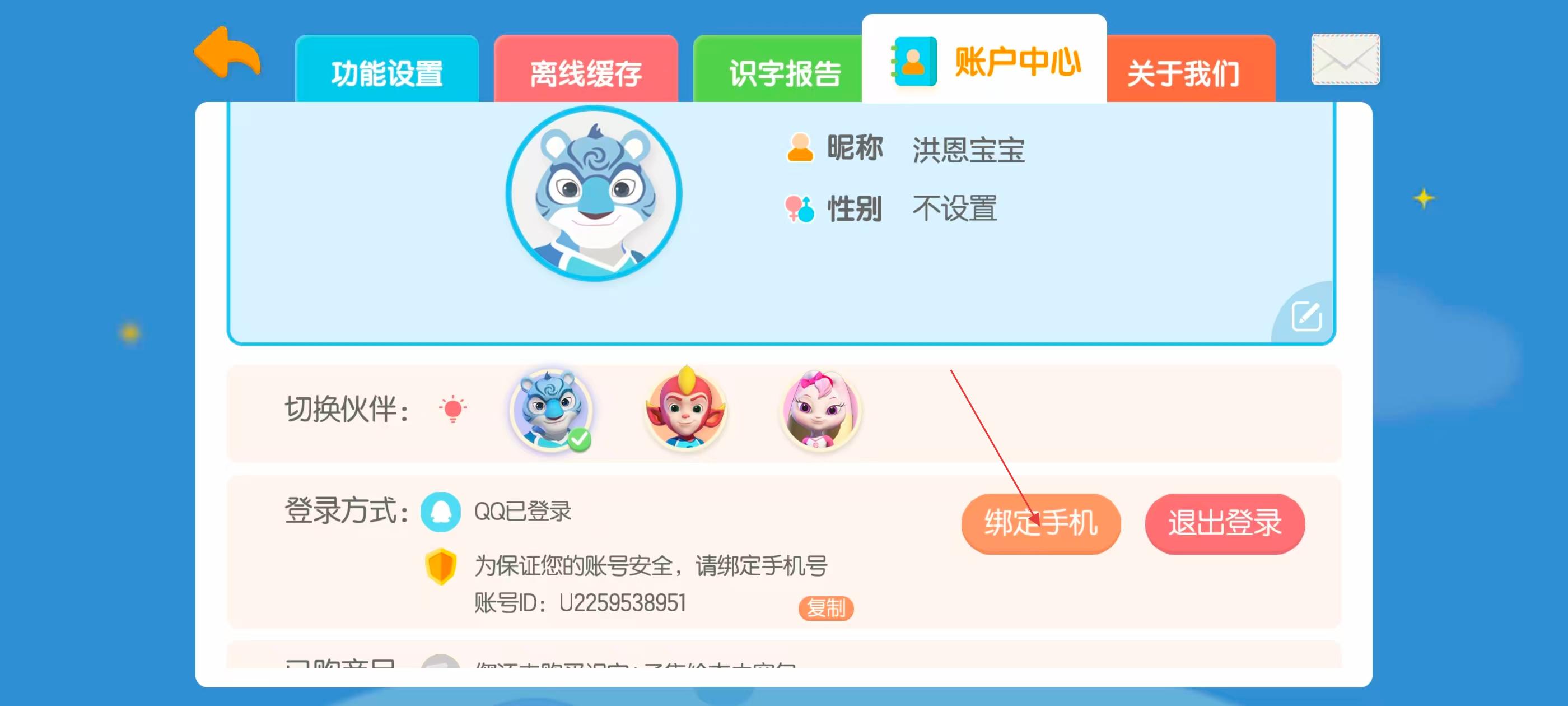 4、在账户中心界面,可切换学习伙伴,查看登录方式,也可点击【绑定手机】提升账号安全性,方便管理孩子的识字学习进度。