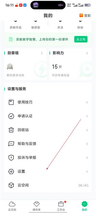 2、在“我的”页面中,找到【设置与服务】板块下的“设置”选项并点击,进入设置界面。