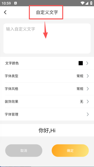 2、进入自定义文字设置页面,在输入框填写内容后,能调整文字颜色、字体类型等参数,完成后点击确定应用。