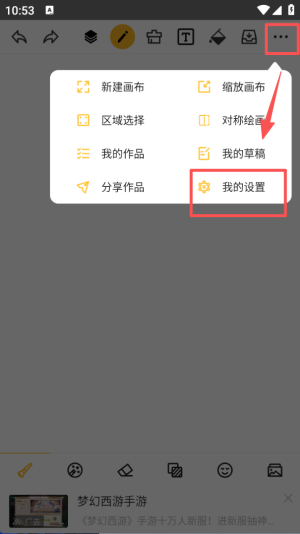 3、点击绘画界面右上角的更多按钮,在弹出菜单里选择 “我的设置”,可进入设置页面调整各类功能参数。