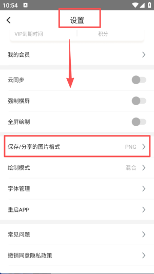 4、在设置页面中,能选择保存或分享图片的格式,还可调整绘制模式、管理字体等,按需配置软件使用选项。