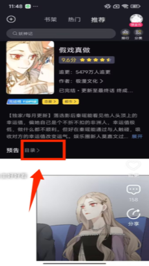 2 、作品详情页展示 “假戏真做” 封面与评分,中间有简介与更新信息,底部有 “目录” 与 “评论” 按钮。
