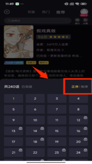 3 、章节列表页面显示 “共 240 话 已完结”,中间是数字章节导航,底部有 “正序”“倒序” 切换按钮。