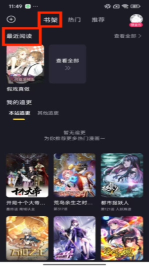 4 、书架展开页顶部有 “最近阅读” 标签,中间是作品缩略图与 “查看全部” 入口,下方是追更作品列表。