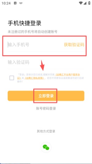 1、进入登录页,在手机快捷登录栏输入手机号,点击 “获取验证码”,填好验证码并勾选协议后点 “立即登录”。