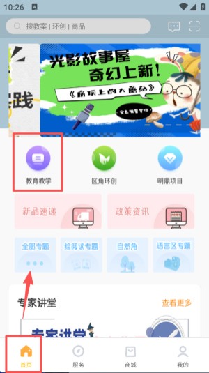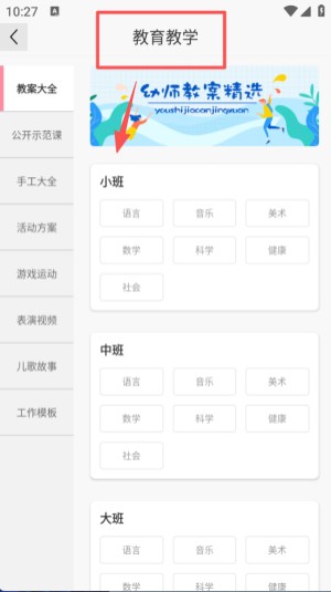 2、登录后回到首页,点击 “教育教学” 选项,进入后可看到按小、中、大班分类的学科内容,涵盖语言、音乐等类别。