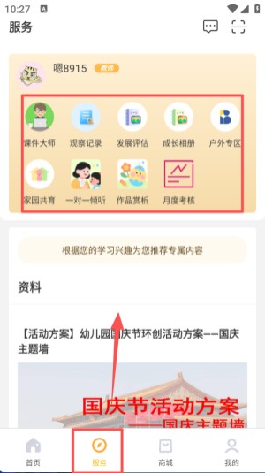 4、在服务页面的资料板块,会根据学习兴趣推荐专属内容,比如幼儿园节庆环创活动方案等实用资料。