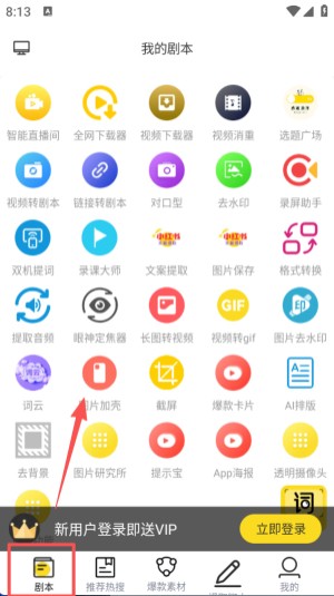 1 、我的剧本页面展示智能提词器、全网下载等功能图标,涵盖视频处理、格式转换等工具,底部有功能导航栏。