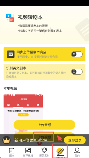 3 、视频剧本页面说明可选择视频转文字剧本,含同步上传剧本商店、识别文案文本等开关,底部有上传视频按钮。