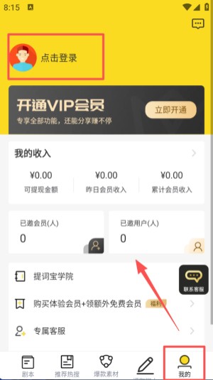 4 、我的页面顶部显示登录入口,中间展示我的收入数据,下方有提词宝学院、专属客服等功能选项,可开通 VIP 会员。