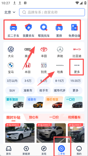 1、选择车辆类别:点击“新车”或“二手车”图标,选择您想要的车辆类型。