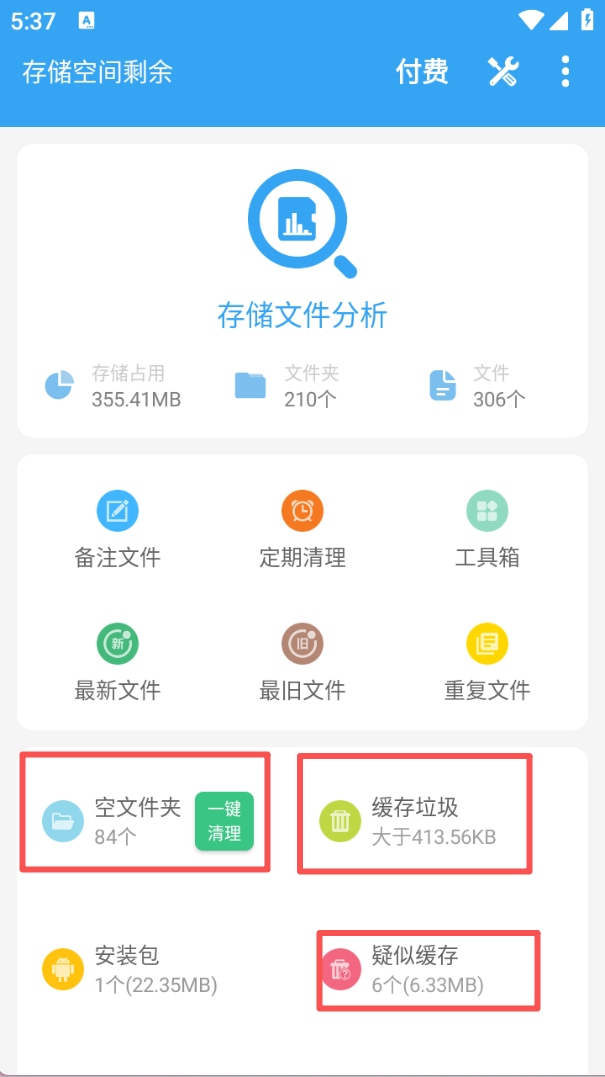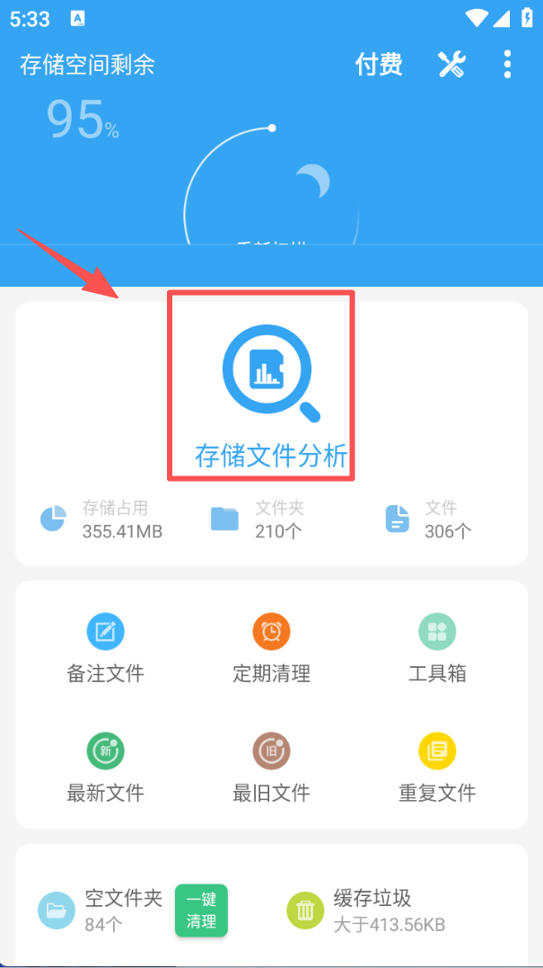 1、进入存储分析页面,能查看存储占用、文件夹数量等数据,还可一键清理空文件夹,处理缓存垃圾等冗余内容。
