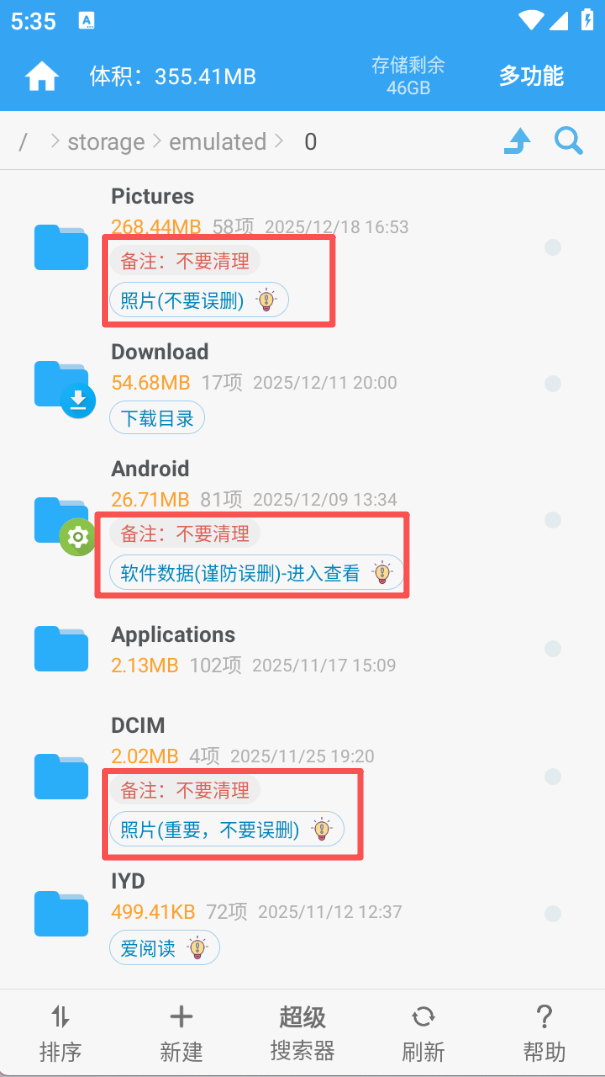 4、在文件夹列表中,可查看不同目录的存储占比,部分重要文件夹会标注 “不要清理” 的提示信息。