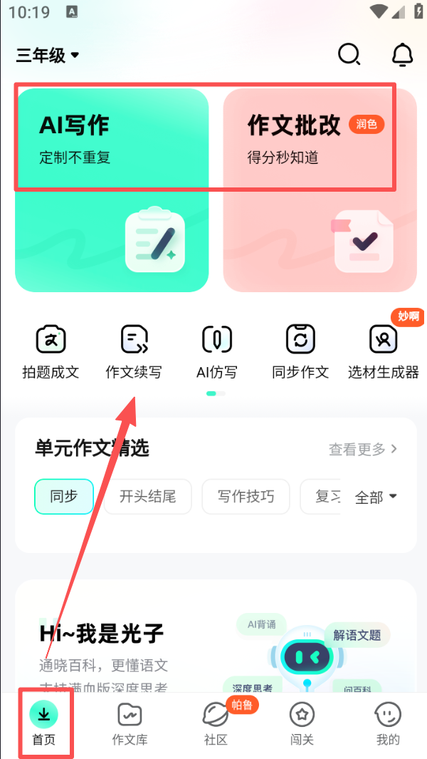 1、打开软件进入首页,能看到 “AI 写作”“作文批改” 等功能板块,还有拍题成文、作文续写等辅助工具可选用。