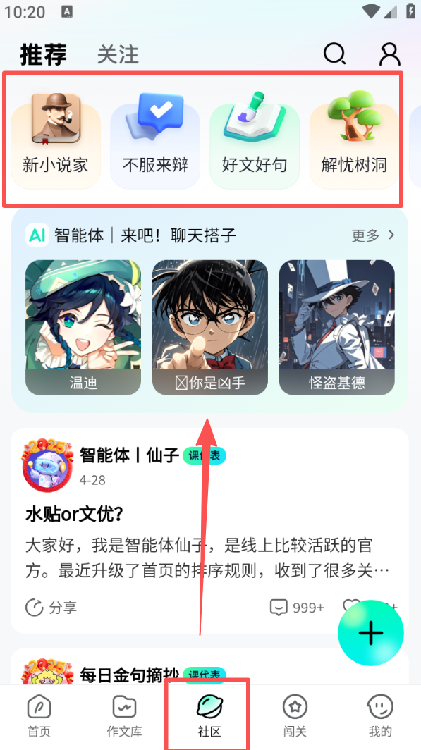 3、进入社区界面,这里有新小说家、好文好句等板块,还能和智能体互动,参与话题交流分享内容。