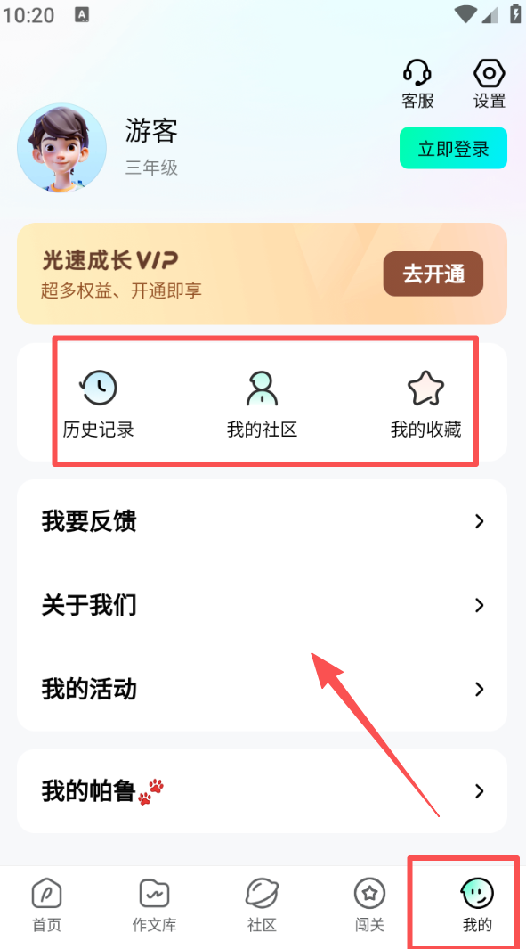 4、点击 “我的” 进入个人页面,能查看历史记录、我的社区内容,也能找到收藏内容,还可参与活动反馈问题。