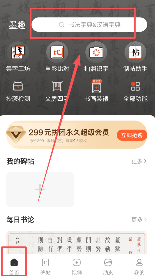 1、进入首页,可利用顶部搜索框查找书法字典或汉语字典,还能使用拍照识字等功能。