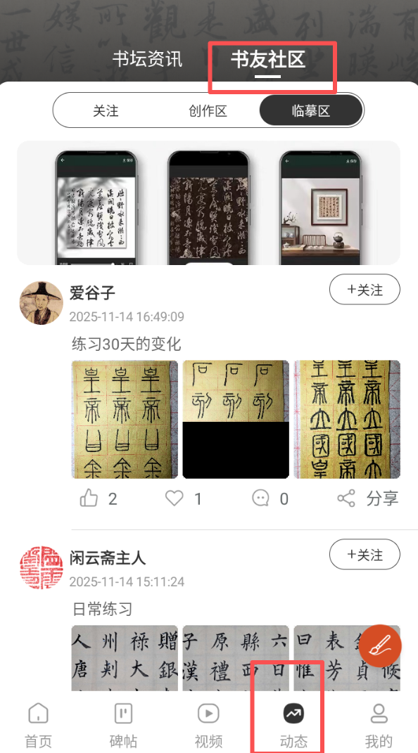 4、进入动态板块的书友社区,可浏览书友的书法练习作品,交流书法学习心得。