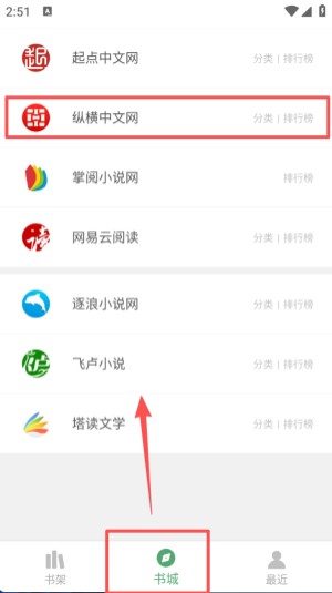 1 、书城页面展示纵横中文网等多个阅读平台,每个平台右侧标注分类与排行榜,底部导航栏当前选中 “书城”。