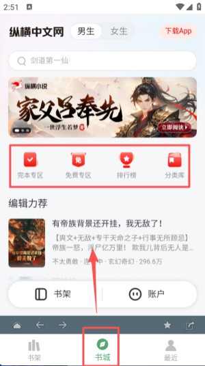 2 、纵横中文网页面顶部有男生、女生分类,中间展示完本专区、免费专区等入口,下方是编辑推荐的作品列表。