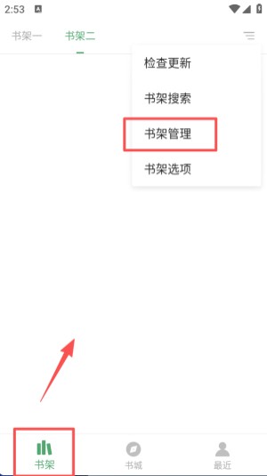 3 、书架页面点击右上角菜单按钮,展开的选项中包含书架管理,点击可进入对应页面调整书架设置。
